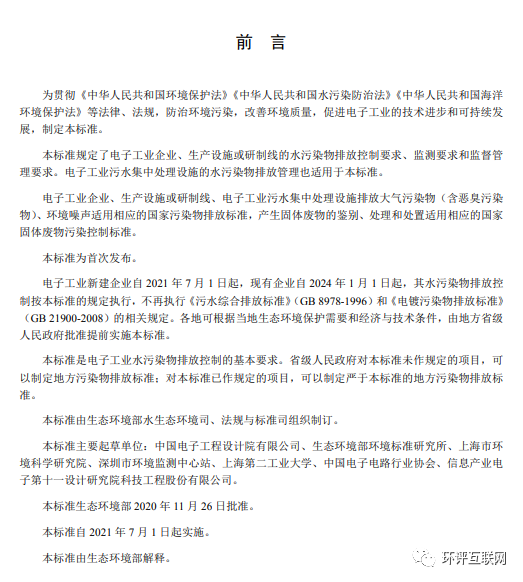 《電子工業(yè)水污染物排放標(biāo)準(zhǔn)》自2021年7月1日起實(shí)施。