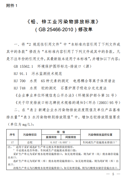 附件:1.《鉛、鋅工業(yè)污染物排放標(biāo)準(zhǔn)》(GB 25466-2010)修改單