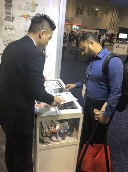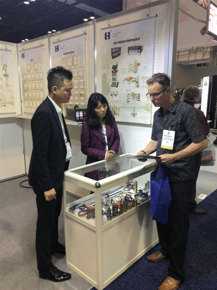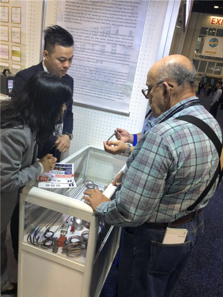 華東儀表此次參展的產品主要為熱流道模具加熱器,展位前,被產品吸引的國際友人絡繹不絕,他們中大多數為美國本土甚至為全球范圍內橡塑行業中的精英。華東儀表過硬的資質、優秀的產品質量以及廠長吳奔專業的解答都給他們留下了深刻的印象。