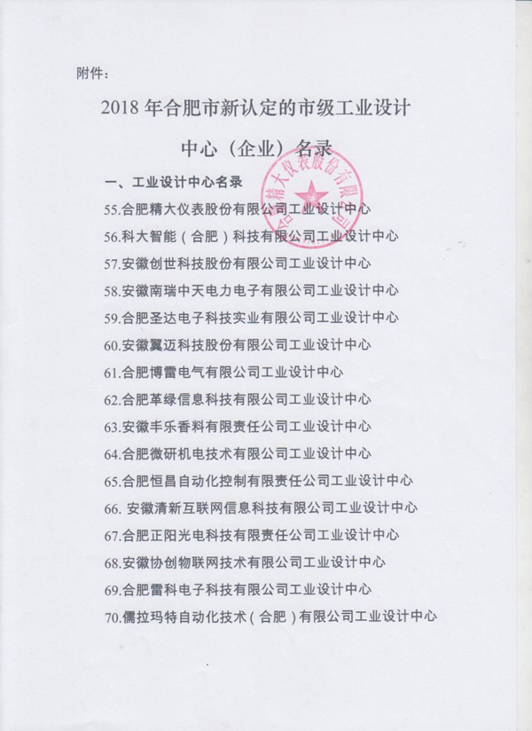 根據(jù)《合肥市市級工業(yè)設(shè)計中心認定管理辦法(試行)》有關(guān)規(guī)定,經(jīng)申報、評審、現(xiàn)場查驗、公示等程序,“合肥精大儀表股份有限公司工業(yè)設(shè)計中心”被評定為合肥市市級工業(yè)設(shè)計中心。詳見“合經(jīng)信科技【2018】526號”。