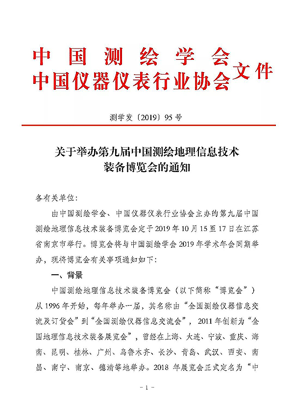 由中國測繪學會、中國儀器儀表行業(yè)協(xié)會主辦的第九屆中國測繪地理信息技術裝備博覽會定于2019 年10 月15 至17 日在江蘇省南京市舉行。博覽會將與中國測繪學會2019 年學術年會同期舉辦。
