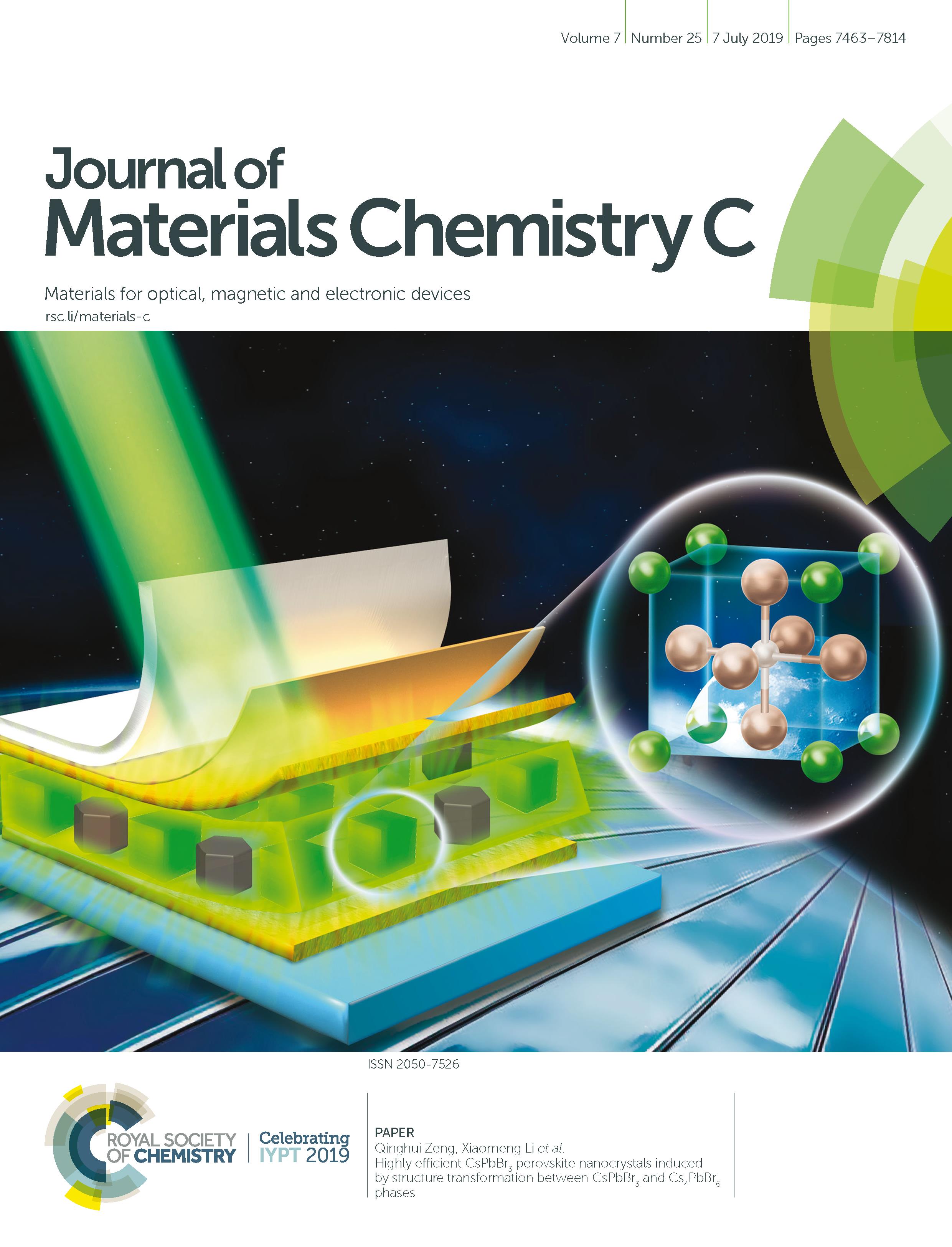 近日,中科院長春光機所曾慶輝副研究員課題組提出一種由于CsPbBr3和Cs4PbBr6的結(jié)構(gòu)轉(zhuǎn)變誘導(dǎo)的高效熒光鈣鈦礦納米晶,所制備的鈣鈦礦納米材料的熒光量子效率可達(dá)99%,并將這種高熒光量子產(chǎn)率的材料應(yīng)用于LED器件方面,該工作對于鈣鈦礦量子點在光電器件領(lǐng)域的應(yīng)用具有十分重要的意義。該成果發(fā)表在英國皇家化學(xué)學(xué)會的《Journal of Materials Chemistry C》(SCI影響因子6.641)雜志上(J. Mater. Chem. C, 2019, 7, 7548--7553)。基于該項工作的出色研究成果,被雜志選為首頁封面文章。該文章的第一作者是在讀博士研究生蘇瑩,通訊作者是曾慶輝。