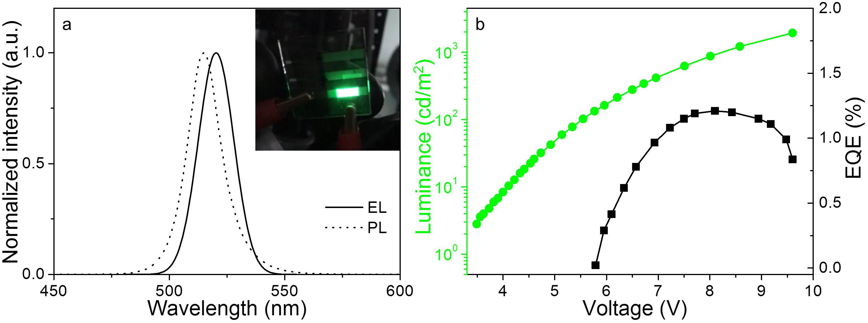 (a)鈣鈦礦量子點做成LED器件前后的熒光發(fā)射光譜和器件照片結(jié)果