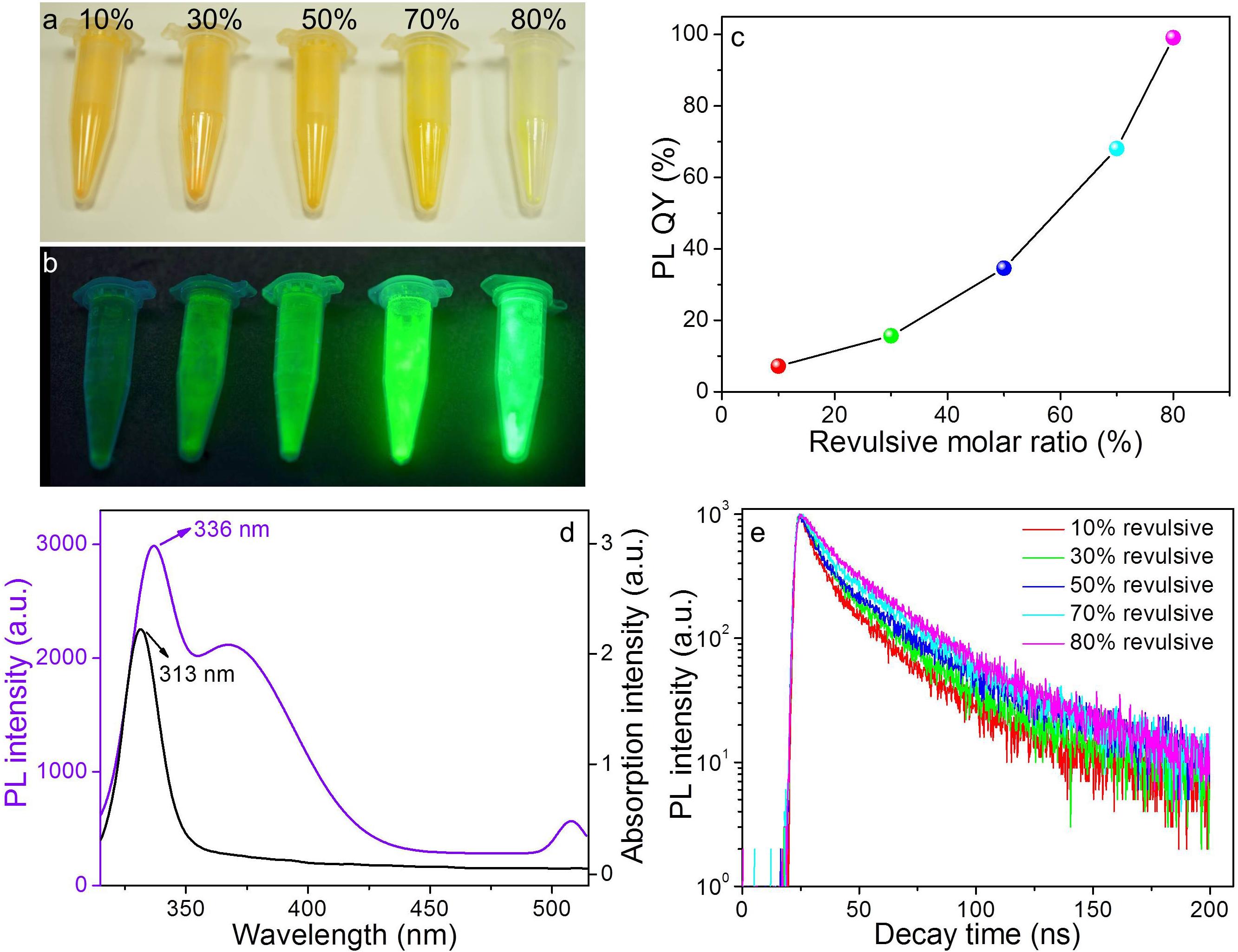 不同比例ZnBr2誘導(dǎo)劑作用下CsPbBr3和Cs4PbBr6鈣鈦礦納米晶在自然光(a)和紫外燈照射下(b)的照片、熒光量子效率(c)和熒光壽命(e);Cs4PbBr6鈣鈦礦納米晶的吸收以及熒光發(fā)射光譜(d)