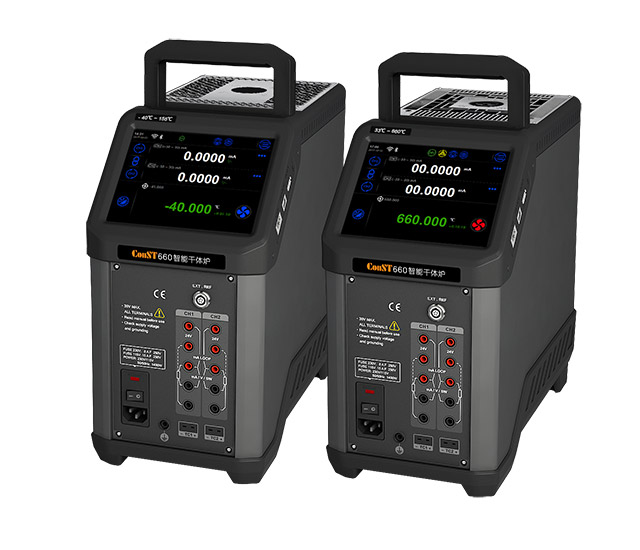 康斯特公司在2017年進行了干體式溫度校準器的技術研發(fā),推出了最新一代智能溫度校準設備。ConST660應用多項創(chuàng)新技術,具有升降溫速度快、抗干擾能力強、環(huán)境適應性好,控溫區(qū)間寬,溫場均勻性好等特點,采用全觸屏操作,伸縮式提手設計,支持外置標準RTD控溫方式,同時具備兩個被檢通道。ConST660的出現(xiàn)有望改變了國外產品在我國一枝獨秀的銷售局面。