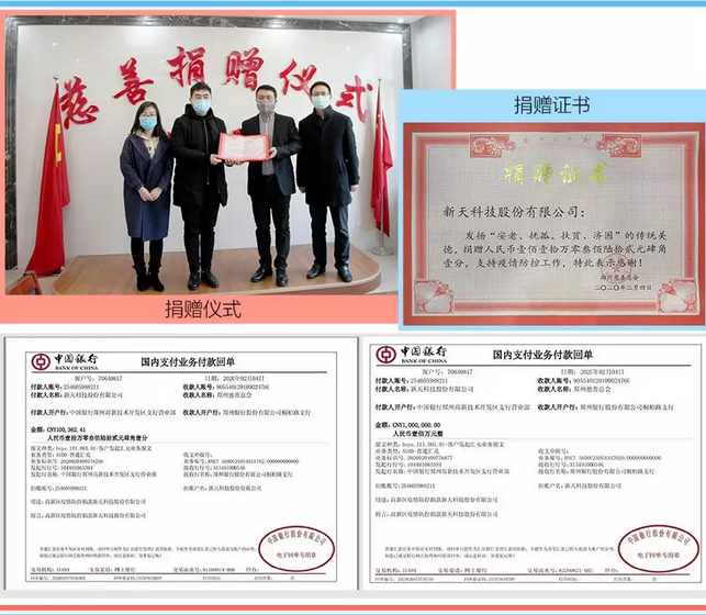 在新天科技董事長費戰(zhàn)波先生、總經(jīng)理常明松先生的支持關(guān)注和帶領(lǐng)下,全體員工踴躍捐贈,短短一天時間,員工通過微信自發(fā)捐贈10余萬元,同時新天科技股份有限公司捐贈100萬元,累計捐贈善款110余萬元,全部匯入鄭州慈善總會賬戶,用于鄭州市以及高新技術(shù)開發(fā)區(qū)新型冠狀病毒肺炎疫情的防控工作。公司總經(jīng)理常明松表示,困難面前,同舟共濟;共同助力,責無旁貸;我們要萬眾一心,我們一定能戰(zhàn)勝疫情!同時也提醒特殊時期新天公司全體員工也要保護好自己和家人!