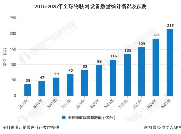 2015年全球物聯(lián)網(wǎng)設(shè)備數(shù)量僅僅38億臺。截止至2018年底全球聯(lián)網(wǎng)設(shè)備數(shù)量已經(jīng)超過170億,扣除智能手機、平板電腦、筆記本電腦或固定電話等連接之外,物聯(lián)網(wǎng)設(shè)備數(shù)量達到70億臺。預(yù)測2019年全球物聯(lián)網(wǎng)設(shè)備數(shù)量將達83億臺。并預(yù)測在2025年全球物聯(lián)網(wǎng)設(shè)備數(shù)量將突破200億臺。