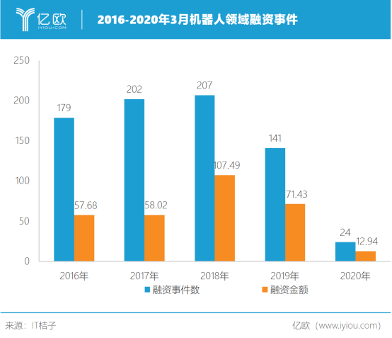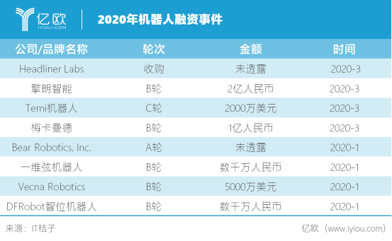 到了2020年,從一月到三月,機器人行業(yè)的融資事件共有8起。3月,擎朗機器人獲得2億人民幣,梅卡曼德獲得1億人民幣。