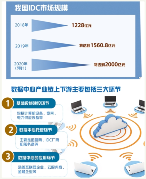 根據(jù)前瞻產業(yè)研究院的數(shù)據(jù),2018年我國IDC市場規(guī)模為1228億元,2019年將達到1560.8億元,同比增長27.1%,按照該統(tǒng)計口徑,且考慮到政策支持力度的加大,預計2020年數(shù)據(jù)中心的市場規(guī)模將達到2000億元。