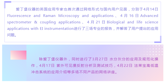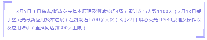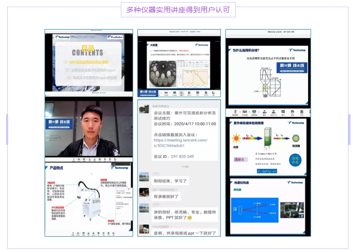 本次千里行期間分析產(chǎn)品共舉辦了15場網(wǎng)絡(luò)講座,內(nèi)容覆蓋了紫外、熒光、拉曼、水分灰分儀、高低溫沖擊系統(tǒng)等多種產(chǎn)品,共計(jì)4500人次參與活動(dòng),受到了用戶的廣泛好評。雖然不能見面,卻通過網(wǎng)絡(luò)拉近了與用戶之間的聯(lián)系,解決用戶實(shí)際問題的同時(shí),也讓我們更加密切的了解到用戶對于儀器未來使用的一些需求,促進(jìn)我們更加努力的完善各項(xiàng)服務(wù)。下面展現(xiàn)一下活動(dòng)情況。