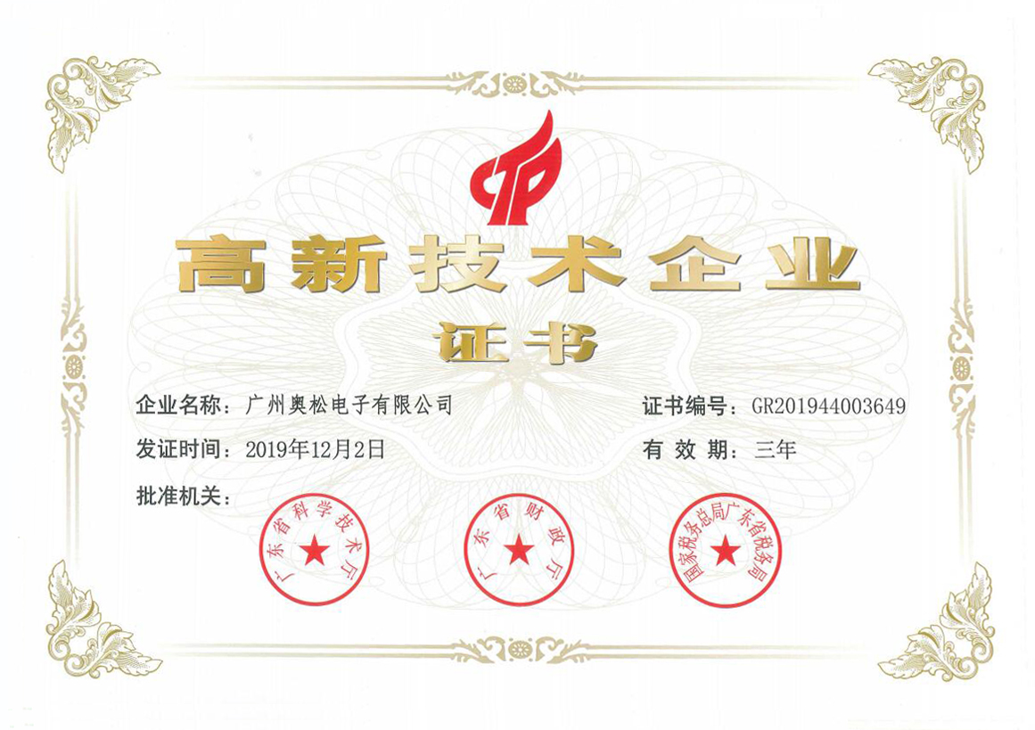 2020年4月13日,廣州奧松電子有限公司在去年12初復審的“高新技術企業(yè)證書”正式審批發(fā)放。據悉,2016年,科技部、財政部、國家稅務總局三部門對2008年的高新認定管理辦法及工作指引進行了重新修訂,高新技術企業(yè)認定與舊的政策相比,申請門檻提高了不少,所以高新技術企業(yè)的認證并不好通過。