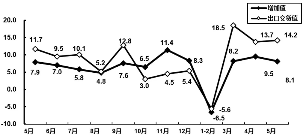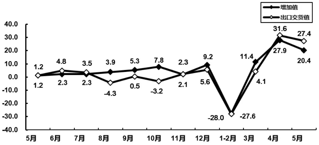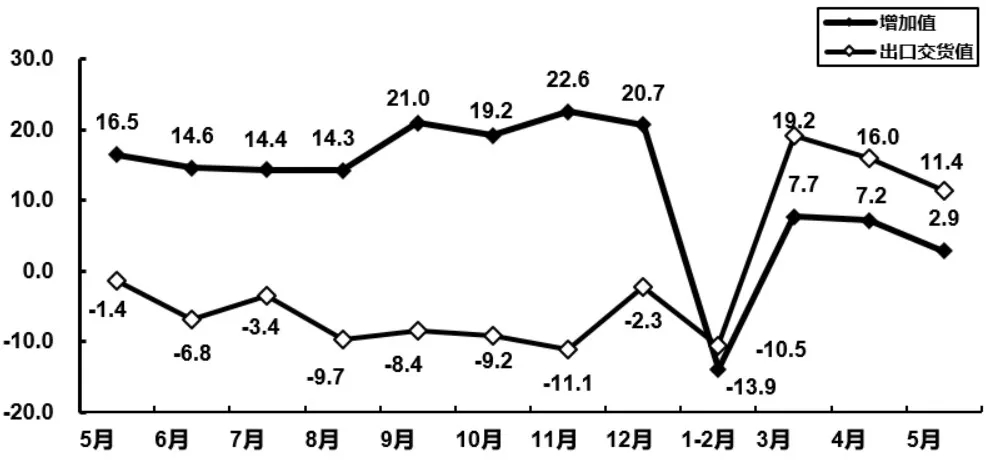 通信設(shè)備行業(yè)增加值和出口交貨值分月增速(%)-數(shù)據(jù)源自工信部