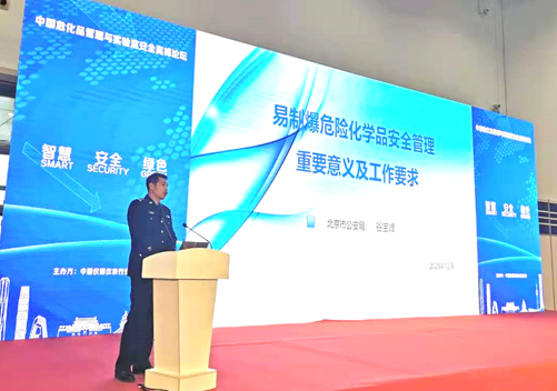北京市公安局治安管理總隊危險物品管理支隊谷寶峰中隊長首先上臺演講。谷隊長以“易致爆危險化學品安全管理重要意義及工作要求”為題,通過引用國內外及其在工作中偵辦的真實案例生動的講述了易致爆危險化學品、易制毒危險化學品對人身和社會帶來的嚴重危害,著重介紹了相關法律法規,闡述了做好?;饭芾韺τ诮ㄔO“平安中國”的重要意義。