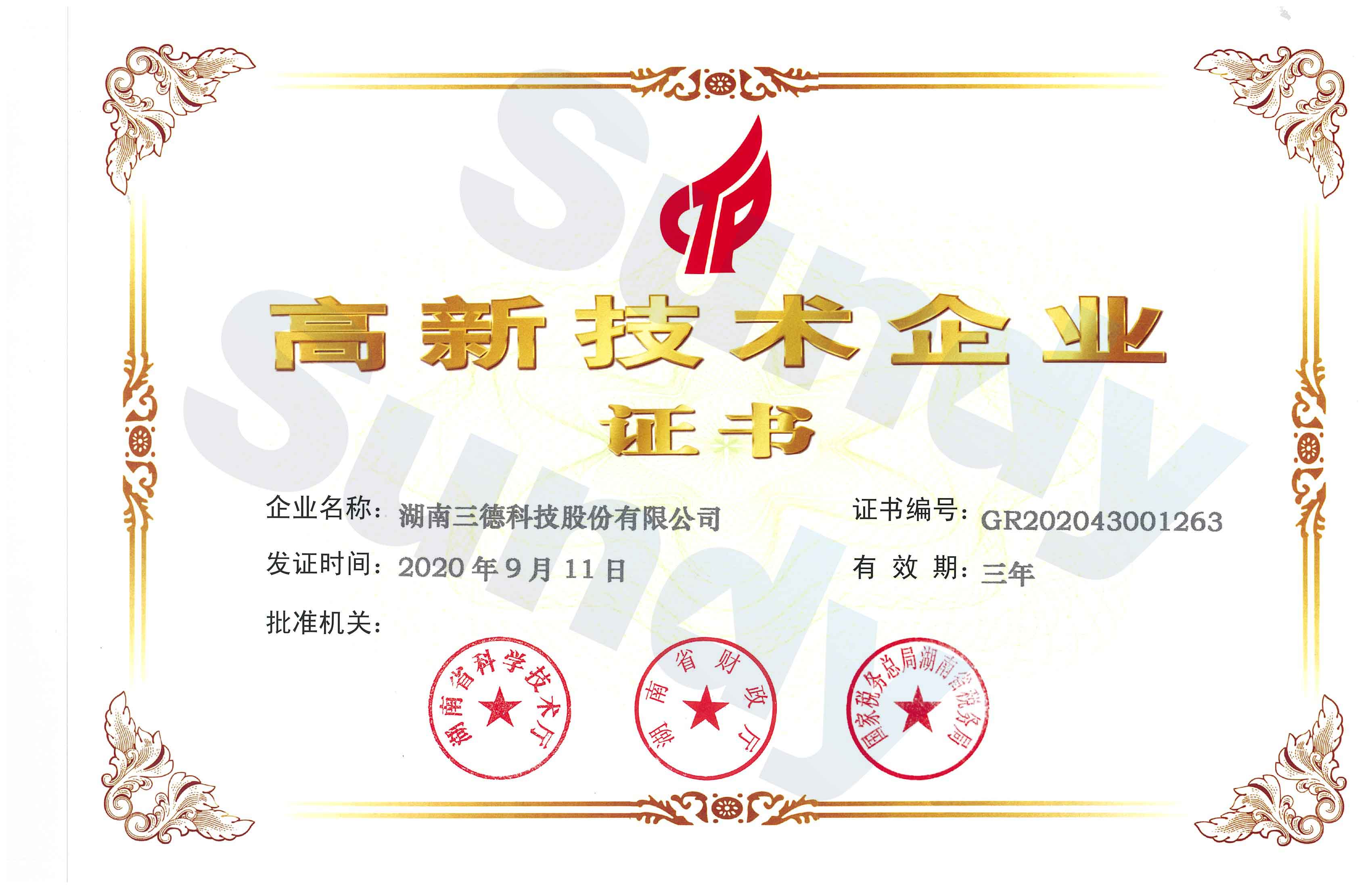 近日,湖南三德科技股份有限公司(下簡(jiǎn)稱“三德科技”)及湖南三德盈泰環(huán)保科技有限公司(下簡(jiǎn)稱“三德環(huán)保”)分別收到湖南省科學(xué)技術(shù)廳、湖南省財(cái)政廳、國(guó)家稅務(wù)總局湖南省稅務(wù)局聯(lián)合頒發(fā)的《高新技術(shù)企業(yè)證書(shū)》,二者同時(shí)獲評(píng)為“高新技術(shù)企業(yè)”。
