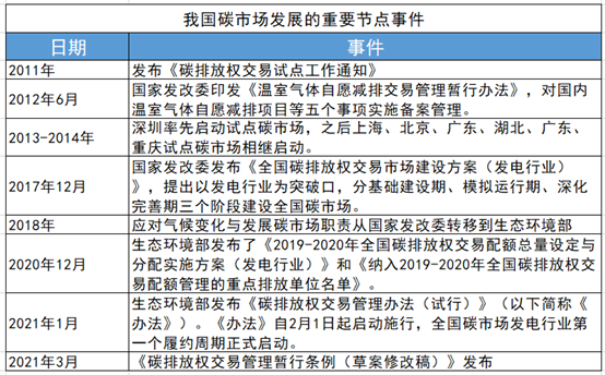 全國碳市場即將“滿月”,一起來看看我國碳市場的前世今生與未來。我國碳市場發展歷史碳排放權交易體系(以下簡稱“碳市場”)是推動我國“雙碳”目標實現的重要制度支撐。過去十年,我國穩健發展碳市場,從2011年首次宣布利用排放權交易管理二氧化碳排放的提議,并于2013年開始在7個省市進行試點,到2021年3月發布《碳排放權交易管理暫行條例(草案修改稿)》,走過了不平凡的歷程。2009年,我國在哥本哈根世界氣候大會上首次承諾,到2020年全國碳強度將相比2005年下降40%~45%。2011年,我國在“十二五”規劃(2011-2015年)中首次提出單位國內生產總值二氧化碳排放的目標。2011年,國家發展改革委選擇北京、天津、上海、重慶、湖北、廣東及深圳7個省市開展試點碳排放交易市場建設。2013年,深圳率先啟動試點碳市場,之后上海、北京、廣東、湖北、廣東、重慶試點碳市場相繼啟動。2015年,我國向聯合國氣候變化框架公約秘書處提交了應對氣候變化國家自主貢獻文件。提出到2030年單位國內生產總值二氧化碳排放量比2005年下降60%~65%,并把應對氣候變化的行動列入“十三五”發展規劃。2020年,我國在聯合國大會上宣布,中國將力爭于2030年前達到峰值,努力爭取2060年前實現碳中和。