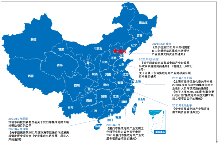為推動集成電路產業快速發展,多地針對集成電路重點科技人員和項目出臺了獎勵和資金支持政策,2021年5月山東省發布了《關于印發山東省集成電路產業財政獎補政策實施細則的通知》及《關于開展山東省集成電路產業財政獎補項申報的通知》兩份文件,文件中對于實施細則和相關要求做了詳細的說明,除山東省之外,北京、上海、深圳、廈門、珠海、金華等地均有文件對項目支持資金相關領域進行詳細的規范。