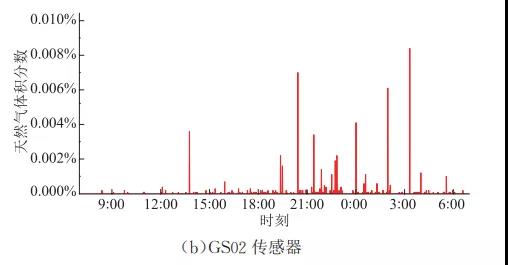 對傳感器運行參數設置完成后,選取系統運行一日的監測數據,分析可知:過濾區與空冷區管道設備種類繁多,包括大量閥門、法蘭等部件,且負責大輸送量的天然氣過濾與冷卻等工藝,其在日常的運行中存在微量泄漏,天然氣體積分數一般處于200×10-6以下,遠低于爆炸極限,處于安全水平。此外,該工藝區在7:00與0:00均監測到較高的天然氣泄漏,此現象與該時間段輸氣壓力較高有關。而增壓區的設備主要是輸氣管道,工藝較為簡單,因此存在的微泄漏現象相比過濾區與冷卻區輕微,天然氣體積分數多集中在100×10-6下。以上監測結果符合壓氣站實際情況,說明該系統具有較好的準確性與實用性。
