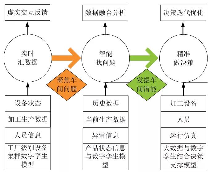 其理念如圖5所示,首先,通過設備狀態、工廠級別設備集群數字孿生模型等將數據實時匯聚起來,實現虛實交匯反饋;然后聚焦車間問題,明晰解決機制,發現問題→分析原因→快速決策。然后,基于歷史數據、產品狀態信息與數字孿生模型等,利用人工智能算法完成查找問題方案,實現數據融合分析;進而發掘車間潛能,實現優化迭代,找到優化方向→逐步提升效果。最后,利用加工設備、大數據與數字孿生結合決策支撐模型,對管控平臺精準決策,并對決策迭代持續優化。