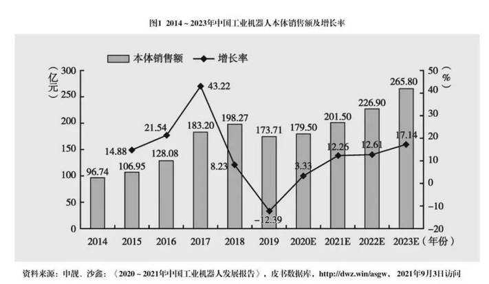 需求方面,國家政策的支持和智能制造加速升級,使工業機器人市場規模持續迅速增長。根據2019年8月中國電子學會發布的《中國機器人產業發展報告2019》,我國生產制造智能化改造升級的需求日益凸顯,工業機器人需求依然旺盛,我國工業機器人市場保持向好發展,約占全球市場份額三分之一,是全球第一大工業機器人應用市場。另外,根據國際機器人聯盟(IFR)統計,我國工業機器人密度在2017年達到97臺/萬人,超過全球平均水平,并將在2021年突破130臺/萬人,達到發達國家平均水平。如圖1所示,從長期來看,制造企業對工業機器人仍有巨大需求,機器人價格下行的態勢也將延續。在“量增價降”綜合因素作用下,工業機器人本體銷售額平穩增長,預計到2023年將達265.8億元。此外,隨著部分西方國家對華扼制戰略的推進,我國工業機器人在快速發展的同時,也在加快工業機器人伺服電機、減速器、控制器等關鍵部件的國產替代。工業機器人核心部件國產化,也將成為未來發展的重要趨勢。