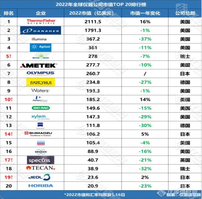 下表是2022年全球儀器公司市值TOP20排行榜: