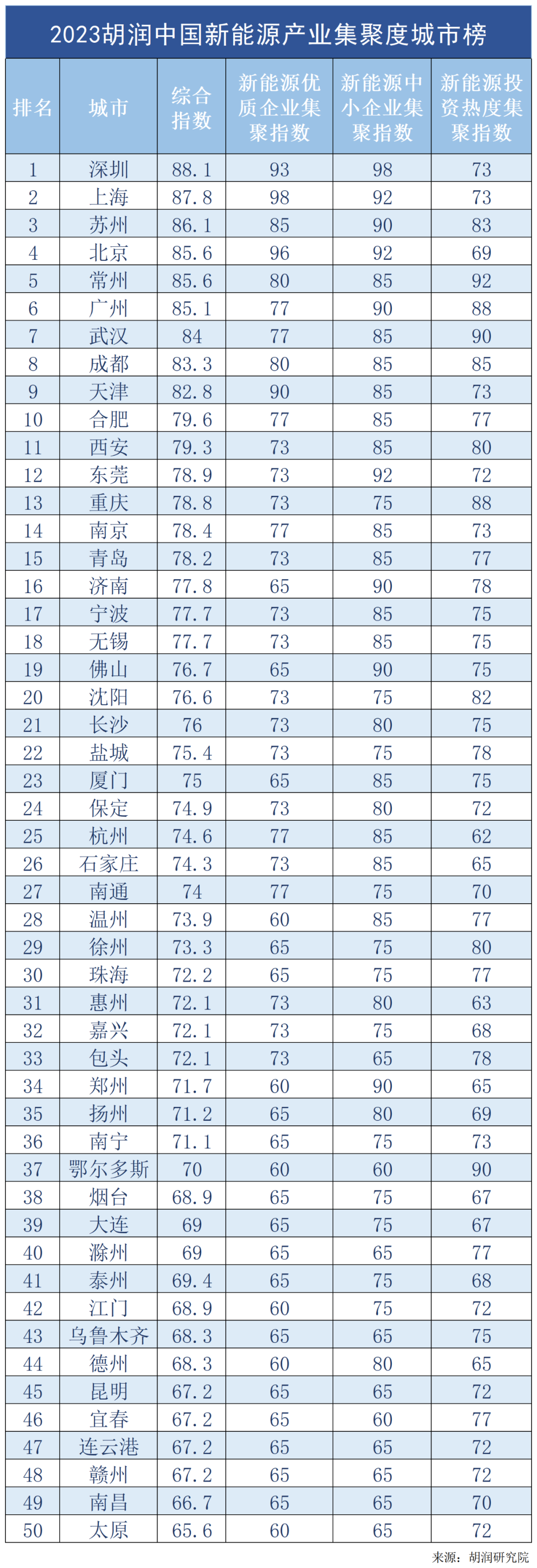 從《2023胡潤中國新能源產業集聚度城市榜》來看,50強城市中,27個城市排名比去年上升,包含7個新上榜城市:嘉興、包頭、南寧、鄂爾多斯、江門、宜春、南昌;此外,天津新進前十,排名上升2位,位列第九;重慶、沈陽、保定排名上升最多。同時,也有27個城市排名下降,其中7個城市今年落榜。