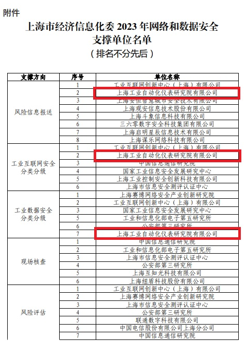 6月21日,上海市經濟和信息化委員會(以下簡稱“經信委”)發布2023年網絡和數據安全支撐單位名單(滬經信軟[2023]513號),上海工業自動化儀表研究院有限公司(以下簡稱“自儀院”)在風險信息報送、工業互聯網安全分類分級、工業數據安全分類分級、風險評估、應急保障領域成功入選。