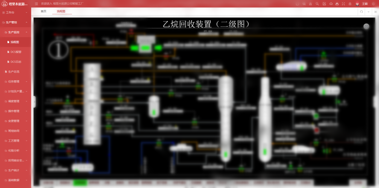 具有查看權限的人員可以選擇查看對應裝置流程畫面,畫面數據和設備狀態動態刷新,使得生產管理人員及時了解當前的裝置運行狀態,便于及時發現生產過程存在的異常,并進行及時處理。