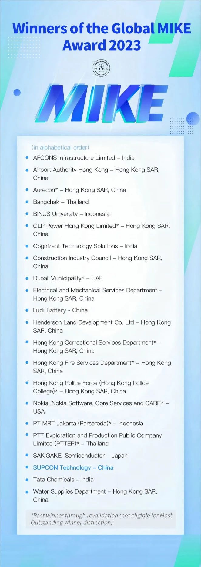 在2023年的全球MIKE大獎評選中,共有八個國家/地區參與,包括中國(內地)、中國香港、印度、印度尼西亞、日本、泰國、阿聯酋和美國。經過嚴格的評選,共有22家組織脫穎而出,榮獲2023全球MIKE大獎。在獲獎的22家組織中,僅有2家來自中國內地,其中中控技術是其中之一。此外,Google、Amazon、Apple、Microsoft等國際知名企業也曾獲得該獎項。