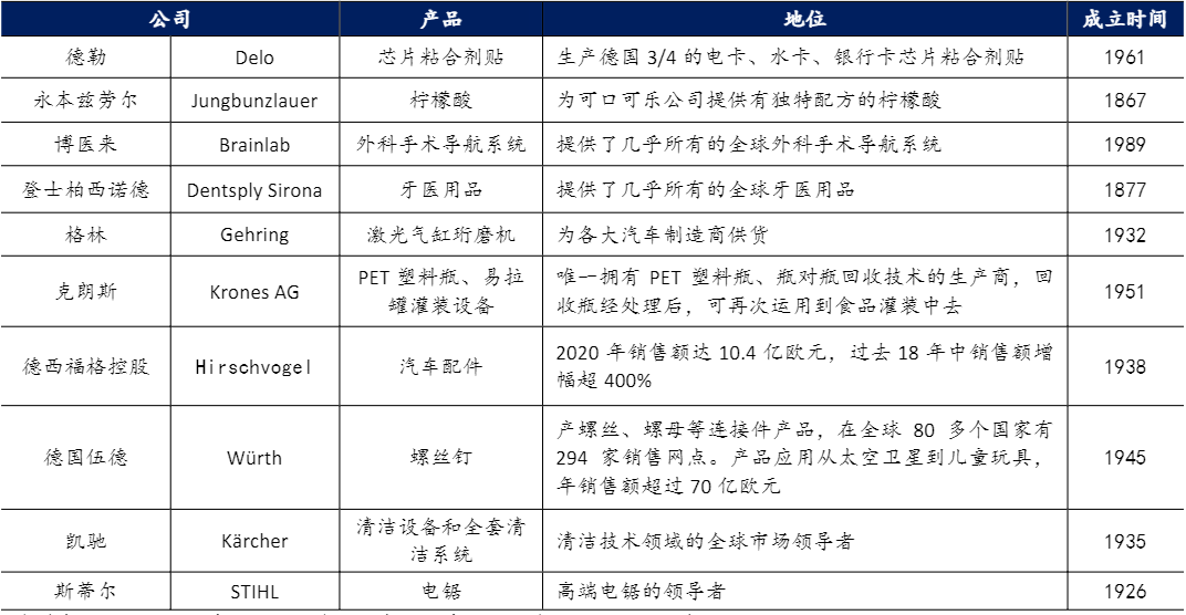 表:部分德國中小企業(yè)已成為細(xì)分領(lǐng)域巨頭或唯一供應(yīng)商