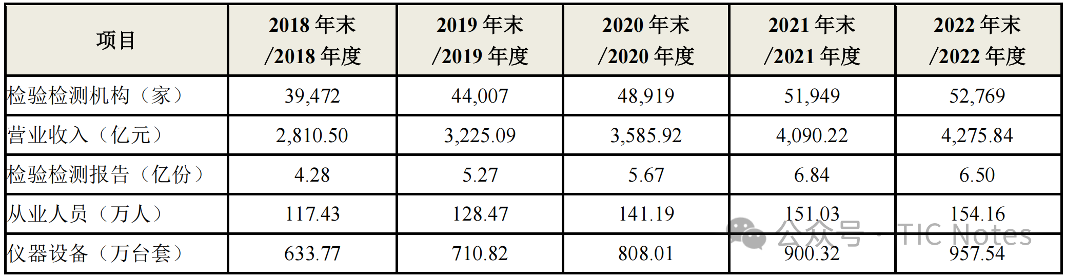 我國(guó)檢驗(yàn)檢測(cè)服務(wù)業(yè)現(xiàn)已覆蓋建筑工程、環(huán)保、衛(wèi)生、農(nóng)業(yè)、質(zhì)檢、食品、藥品、機(jī)械、電子、輕工、紡織、航空等國(guó)民經(jīng)濟(jì)各個(gè)領(lǐng)域,根據(jù)國(guó)家市場(chǎng)監(jiān)督管理總局于 2023 年 6 月發(fā)布的《2022 年度全國(guó)檢驗(yàn)檢測(cè)服務(wù)業(yè)統(tǒng)計(jì)簡(jiǎn)報(bào)》(以下簡(jiǎn)稱“統(tǒng)計(jì)簡(jiǎn)報(bào)”),我國(guó)檢驗(yàn)檢測(cè)行業(yè)規(guī)模繼續(xù)擴(kuò)大;2022 年末,獲得資質(zhì)認(rèn)定的各類檢驗(yàn)檢測(cè)機(jī)構(gòu) 52,769 家,較 2021 年末增長(zhǎng) 1.58%;2022 年度實(shí)現(xiàn)營(yíng)業(yè)收入 4,275.84 億元,較 2021 年度增長(zhǎng) 4.54%;2022 年度共向社會(huì)出具檢驗(yàn)檢測(cè)報(bào)告 6.50 億份,較 2021 年度下降 4.97% 。