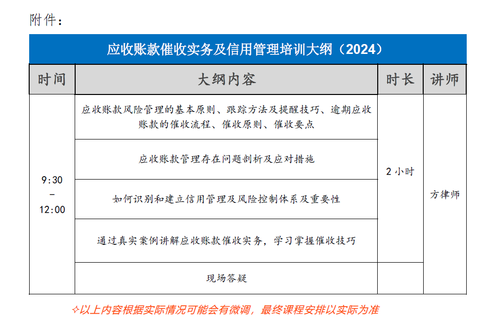 附件:應(yīng)收賬款催收實務(wù)及信用管理培訓(xùn)大綱(2024)