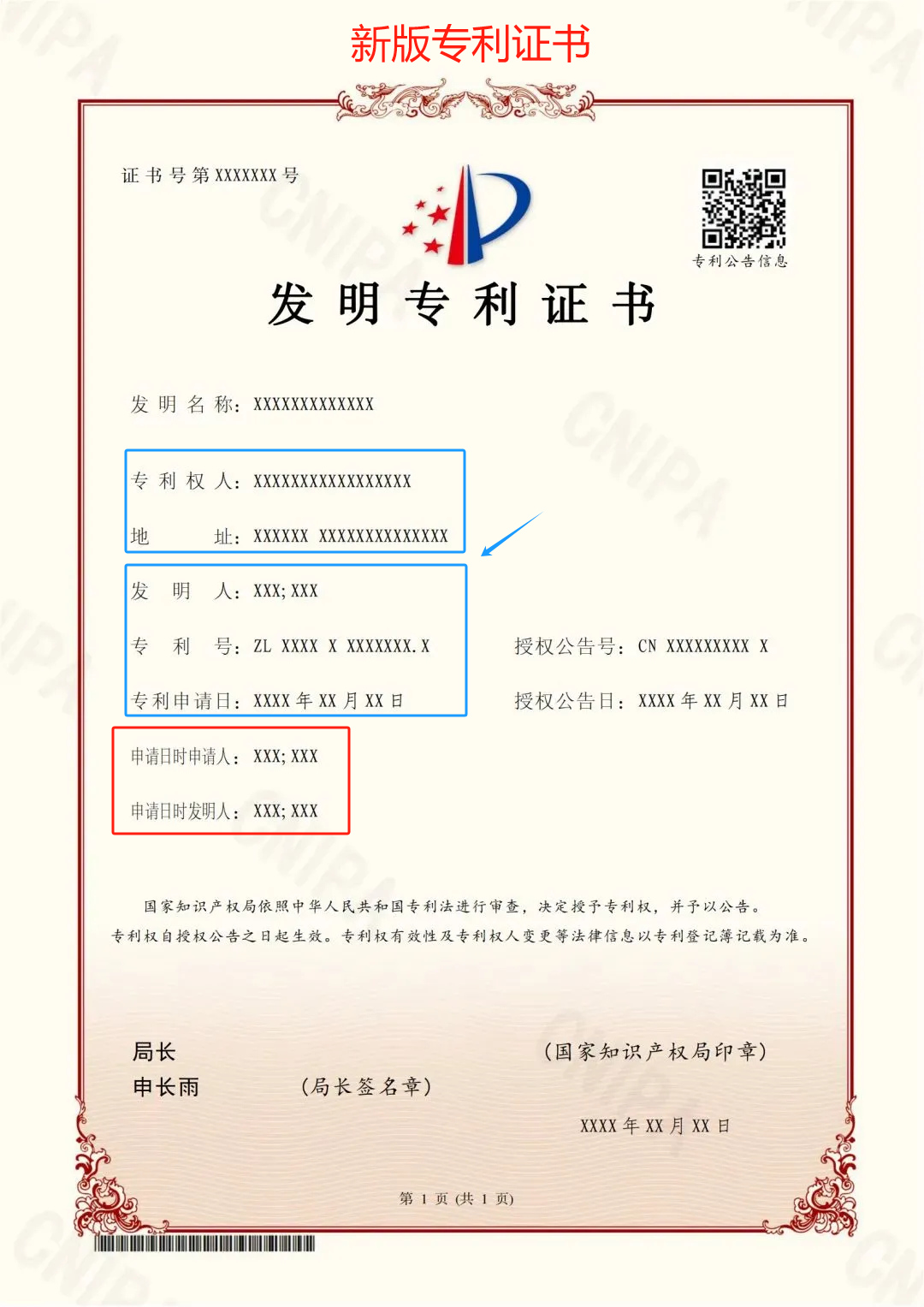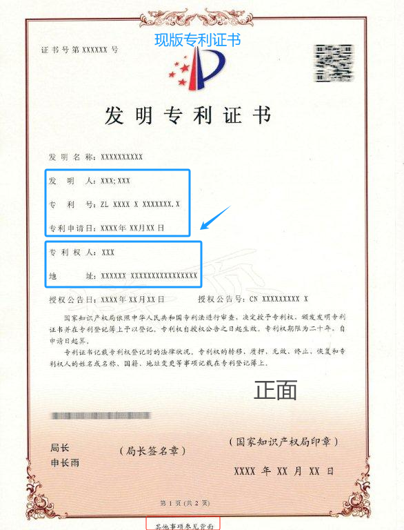 對于授權公告日在2024年6月1日之后(含當日)的專利,國家知識產權局頒發新版專利證書。新版專利證書沿用A4規格豎排版式,優化調整著錄事項布局。