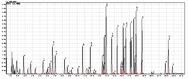 1-氯乙烯;2-1,1-二氯乙烯;3-二氯甲烷;4-反式-1,2-二氯乙烯;5-1,1-二氯乙烷;6/7-2,2-二氯丙烷,順式-1,2-二氯乙烯;8-溴氯甲烷;9-三氯甲烷;10-1,1,1-三氯乙烷;11/12-四氯化碳,1,1-二氯丙烯;13/14 -苯,1,2-二氯乙烷;15 -三氯乙烯;16 -1,2-二氯丙烷;17 -二溴甲烷;18-一溴二氯甲烷;19-反-1.3-二氯丙烯;20 -甲苯;21-順-1.3-二氯丙烯;22 -1,1,2-三氯乙烷;23/24 -四氯乙烯,1,3-二氯丙烷;25 -二溴氯甲烷;26-1,2-二溴乙烷;27 -氯苯;28-1,1,1,2-四氯乙烷;29 -乙苯;30/31-間二甲苯、對二甲苯;32/33-鄰二甲苯,苯乙烯;34 -溴仿;35 -異丙苯;36-溴苯;37/38-1,1,2,2-四氯乙烷,1,2,3-三氯丙烷;39-正丙苯;40-2-氯甲苯;41/42-4-氯甲苯,1,3,5-三甲基苯;43-叔丁基苯;44-1,2,4-三甲基苯;45-仲丁基苯;46-1,3-二氯苯;47/48-4-異丙基甲苯,1,2-二氯苯;49-正丁基苯;50-1,4-二氯苯;51-1,2-二溴-3-氯丙烷;52-1,2,4-三氯苯;53/54-六氯丁二烯,萘;55-1,2,3-三氯苯