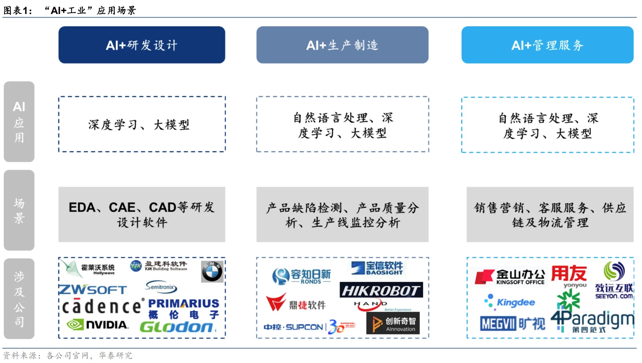 我們看好:1)研發設計,AI有望增進用戶使用EDA/CAD設計及CAE仿真優化等軟件的效率;2)生產制造,AI有望強化工業機器人的信息處理、感知執行等能力;3)管理服務,AI已經被用于基本辦公領域,預計未來將進一步擴展至供應鏈管理、客服服務和市場營銷等其他應用場景。