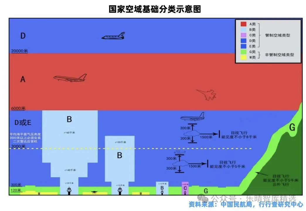 2023年12月民航局發(fā)布的《國(guó)家空域基礎(chǔ)分類方法》中,將空域劃分為A、B、C、D、E、G、W等7類,其中,A、B、C、D、E類為管制空域,G、W類為非管制空域。