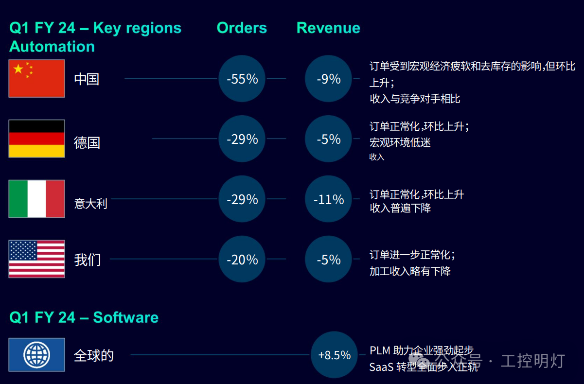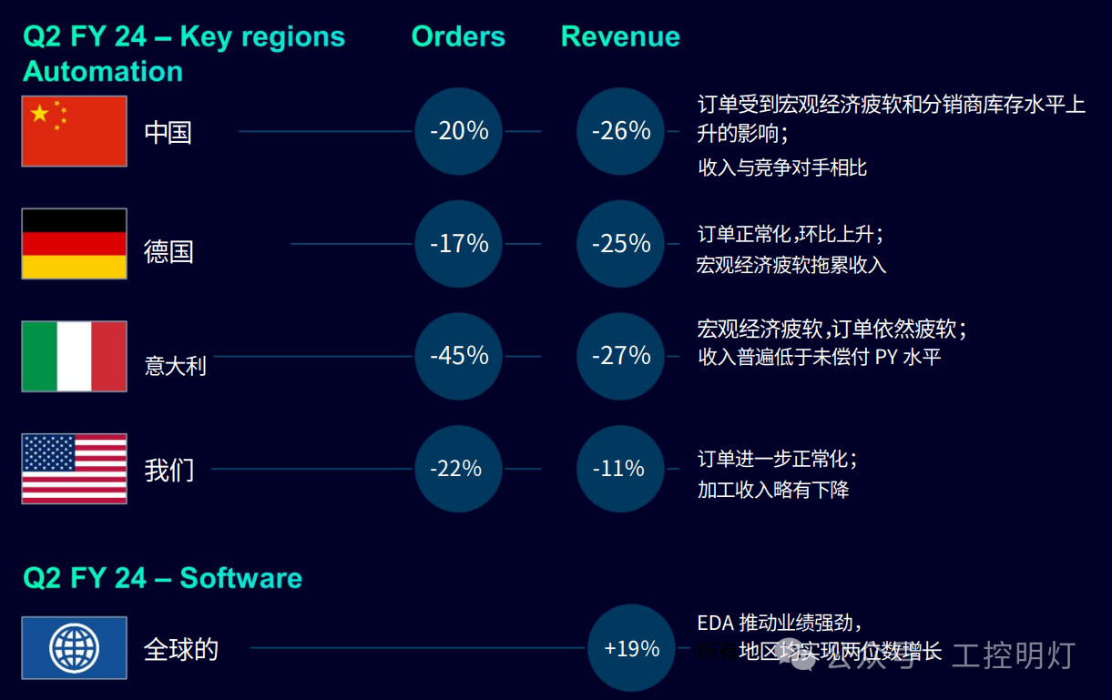 與之前的假設(shè)相反,Digital Industries 自動(dòng)化業(yè)務(wù)的客h去庫存化可能會(huì)持續(xù)到今年下半年,尤其是在中國。對(duì)于 2024 財(cái)年下半年,Digital Industries 假設(shè)其⾃動(dòng)化業(yè)務(wù)的需求將⽐本財(cái) 年上半年有所回升,并預(yù)計(jì)其軟件業(yè)務(wù)將獲得⼤量合同。