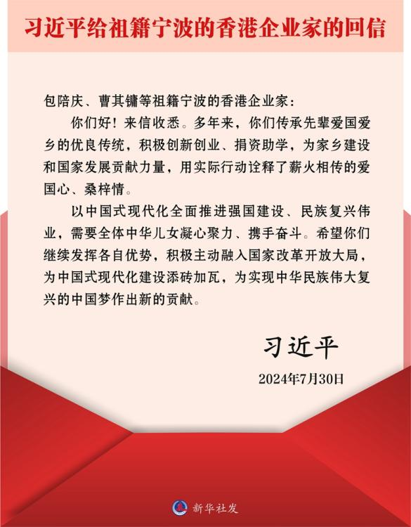 2024年7月30日,習近平總書記給祖籍寧波的香港企業家回信