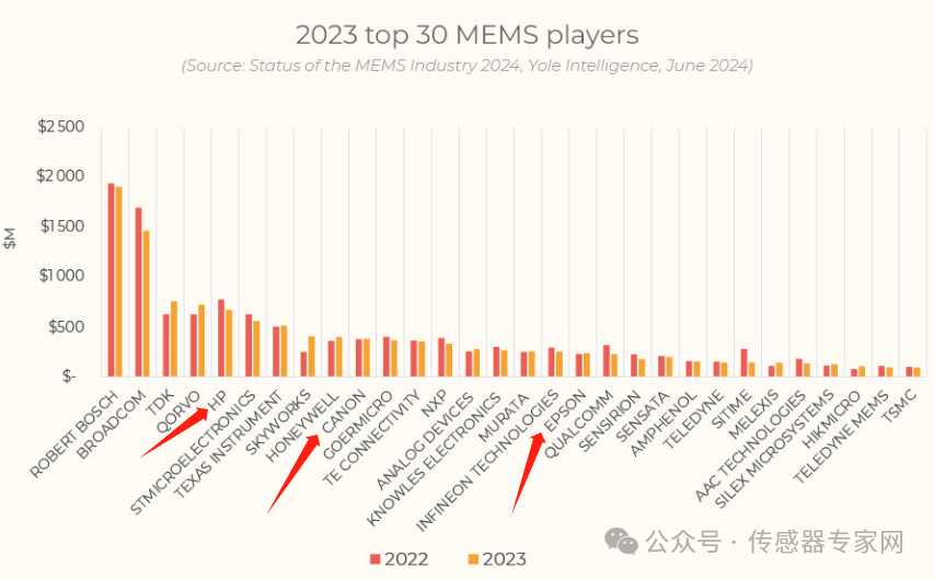 憑借MEMS噴墨打印頭的出貨量,惠普、愛普生、佳能等打印機(jī)廠商長期進(jìn)入全球MEMS器件出貨量TOP 30名單中。