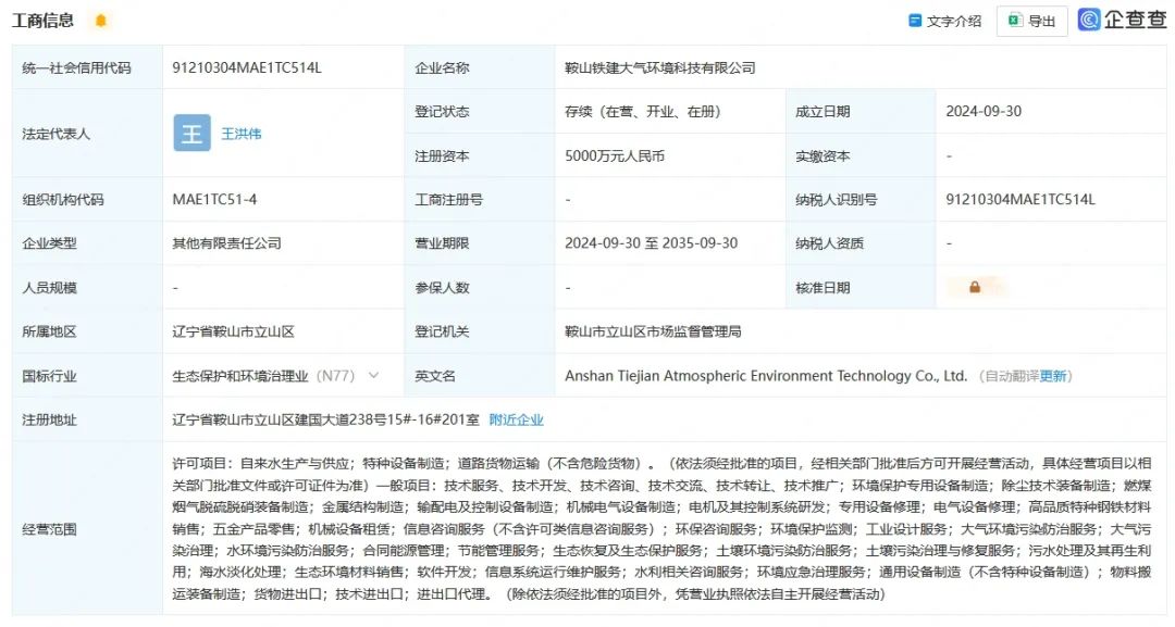 近日,鞍山鐵建大氣環境科技有限公司成立,法定代表人為王洪偉,注冊資本5000萬元,經營范圍包含:大氣環境污染防治服務;大氣污染治理;水環境污染防治服務;合同能源管理等。