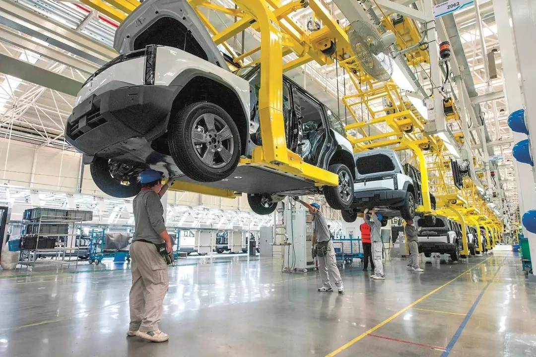 在蕪湖市某新能源汽車生產(chǎn)車間里,工人在進(jìn)行組裝生產(chǎn)作業(yè)。