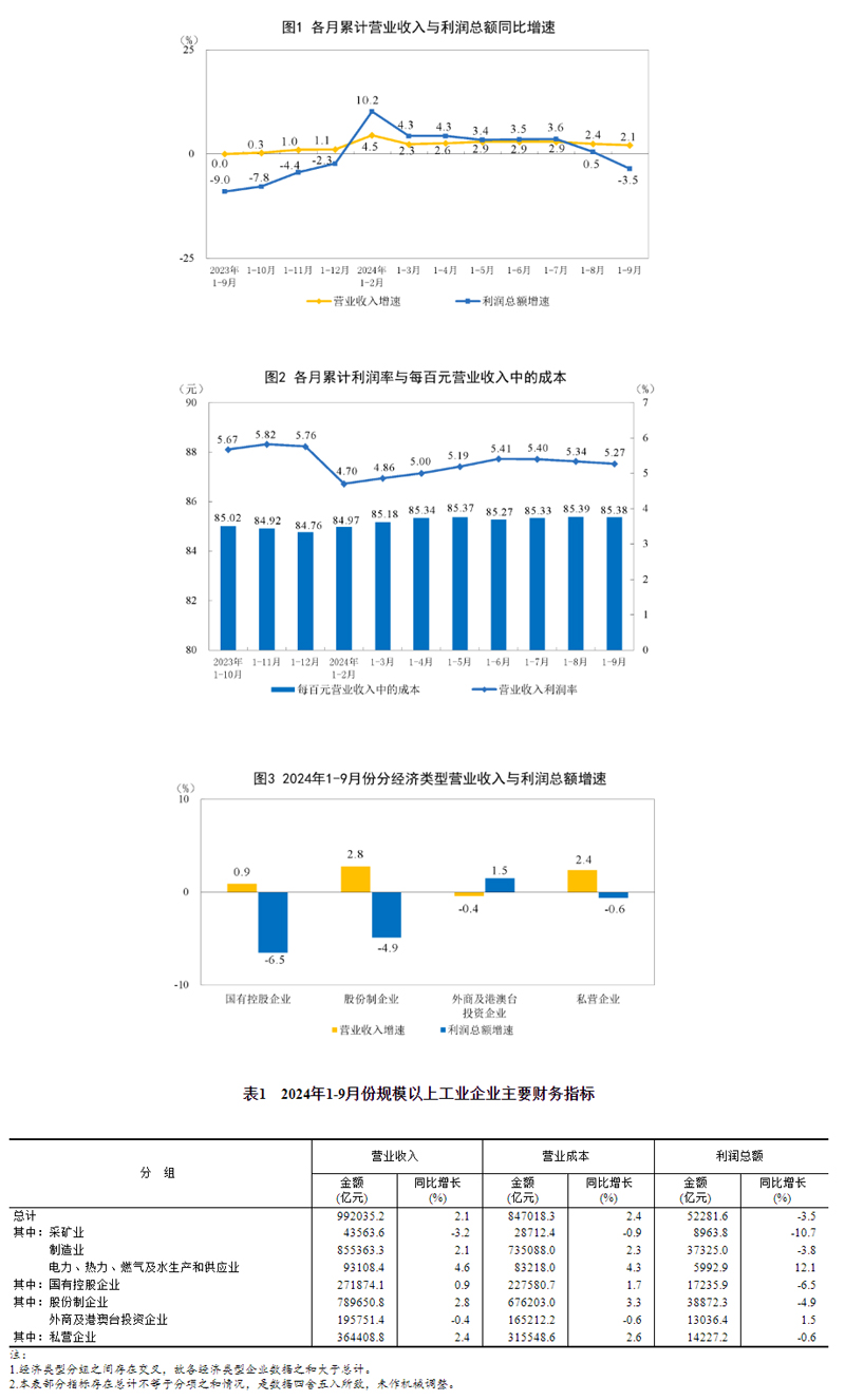 1—9月份,全國規(guī)模以上工業(yè)企業(yè)實現(xiàn)利潤總額52281.6億元,同比下降3.5%(按可比口徑計算,詳見附注二)。