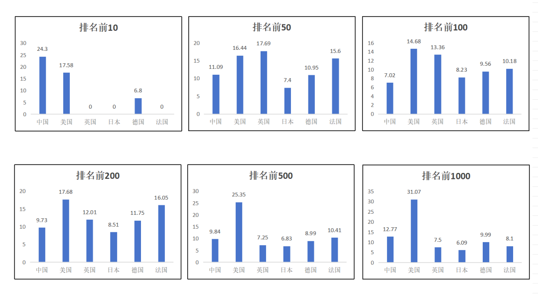 在平均研發投入總額上,中國科技領軍企業表現出了與前兩者截然相反的統計特征。在排名前10的分段中,憑借著華為這一家科技領軍企業,中國的平均研發投入水平占據了約三分之一的比例,略遜于美國。而隨著分段的逐漸向后擴大,中國科技領軍企業所占比例逐漸下降,在排名前1000的分段中其所占比例甚至位于六國之末。