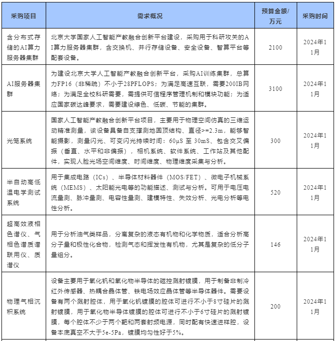 近日,北京大學發(fā)布28項儀器設備采購意向,預算總額達1.86億元,涉及含半自動高低溫電學測試系統(tǒng)、超高效液相色譜儀、氣相色譜質譜聯(lián)用儀、電感耦合等離子體化學氣相沉積系統(tǒng)等,預計采購時間為2024年11月。