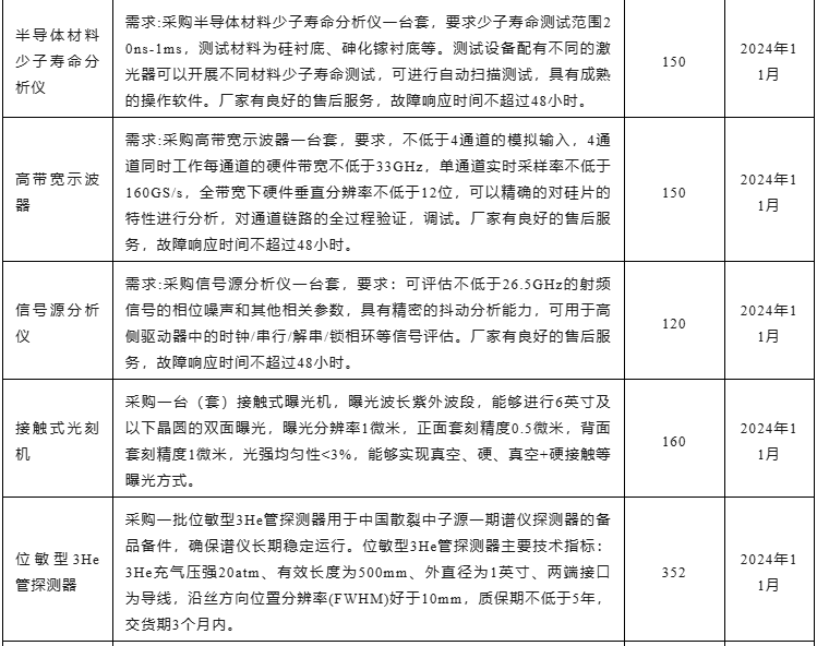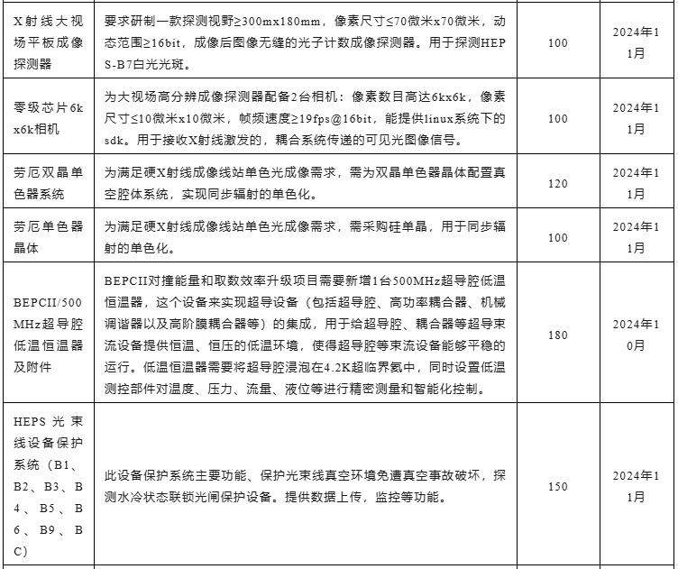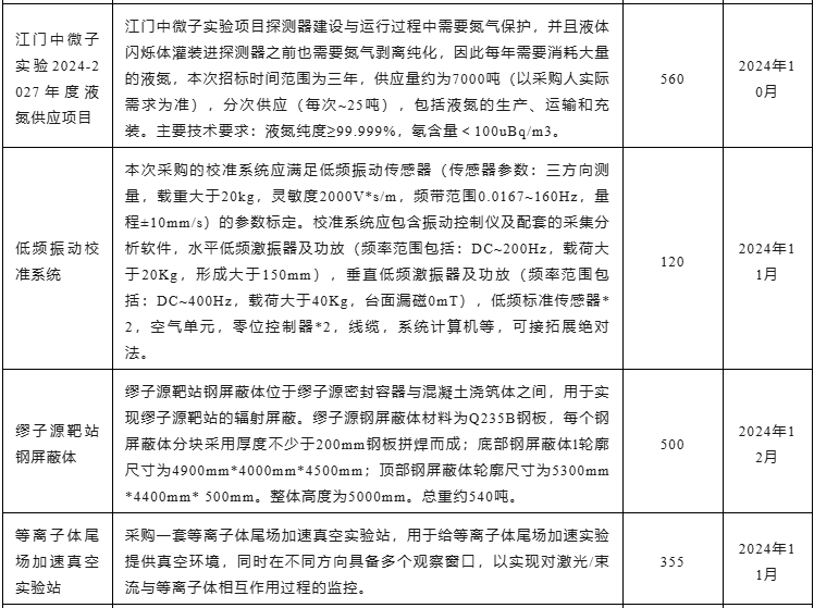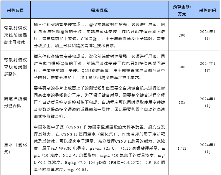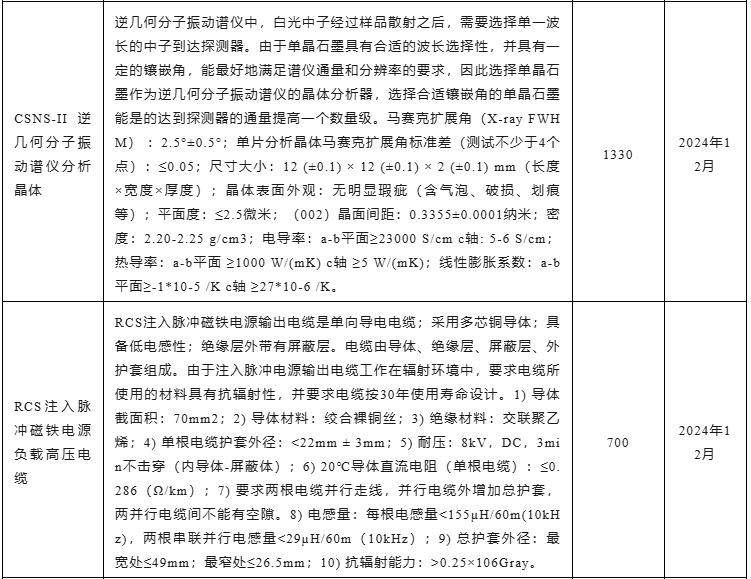 近日,中國科學(xué)院高能物理研究所發(fā)布25項(xiàng)儀器設(shè)備采購意向,預(yù)算總額達(dá)0.98億元,涉及CSNS-II逆幾何分子振動(dòng)譜儀分析晶體、高速細(xì)線楔形鍵合機(jī)、背散射譜儀束線前端鋼屏蔽體、X射線大視場平板成像探測器等,預(yù)計(jì)采購時(shí)間為2024年10月~2025年1月。