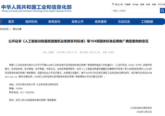 工信部12月30日發(fā)布消息,根據(jù)《工業(yè)和信息化部辦公廳關(guān)于開(kāi)展2024年工業(yè)和信息化百項(xiàng)團(tuán)體標(biāo)準(zhǔn)應(yīng)用推廣典型案例遴選工作的通知》(工信廳科函〔2024〕257號(hào))的程序和要求,經(jīng)項(xiàng)目申報(bào)、形式審查、技術(shù)審查、專(zhuān)家論證、合規(guī)性審查等程序,擬將《人工智能訓(xùn)練服務(wù)器整機(jī)及集群系列標(biāo)準(zhǔn)》等104項(xiàng)團(tuán)體標(biāo)準(zhǔn)列入2024年百項(xiàng)團(tuán)體標(biāo)準(zhǔn)應(yīng)用推廣典型案例,現(xiàn)面向社會(huì)公開(kāi)征求意見(jiàn)。