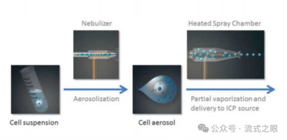 樣品引入:細(xì)胞在被引入質(zhì)譜儀時被霧化成微小的 droplets(液滴),這個過程將含有金屬標(biāo)簽抗體或其他細(xì)胞探針標(biāo)記的單細(xì)胞懸液引入等離子體炬中(圖2-1)。