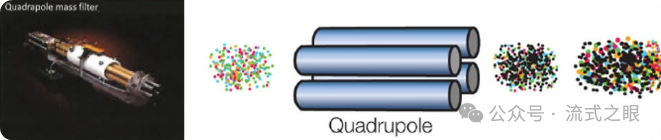 產(chǎn)生的離子云通過真空錐接口進(jìn)入四極離子偏轉(zhuǎn)器,采用四極桿按照離子的質(zhì)荷比(m/z)對離子進(jìn)行過濾并富集,去除常見的生物元素離子,只富集含有目標(biāo)金屬報告離子(根據(jù)質(zhì)荷比大小)的部分(圖2-4)。這樣可以提高后續(xù)質(zhì)譜分析的準(zhǔn)確性和特異性,只檢測與抗體結(jié)合的重金屬標(biāo)記的蛋白質(zhì)離子。