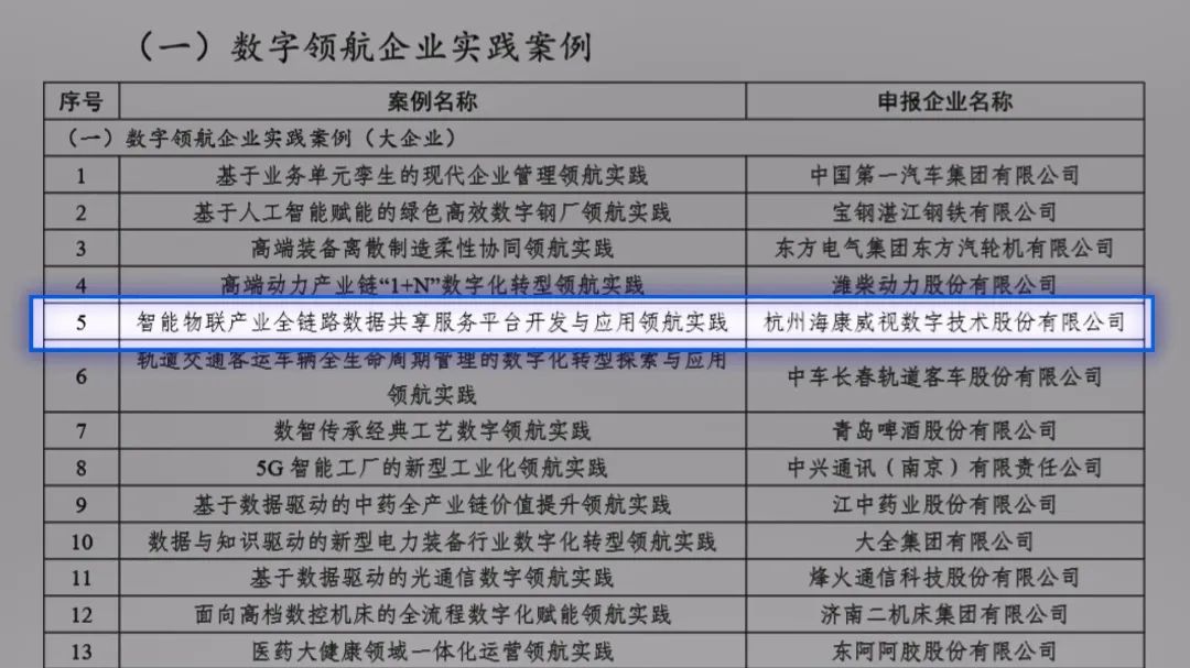 典型案例圍繞數字化轉型通用工具產品、工業互聯網平臺創新領航應用、數字領航企業實踐、數字化供應鏈生態4個方向。海康威視根據自身數字化轉型實踐報送申請的“智能物聯產業全鏈路數據共享服務平臺開發與應用領航實踐”入選數字領航企業實踐案例名單。同時,海康威視多項創新數字化產品,憑借在各行各業的數字化應用成效,入選數字化轉型通用工具產品案例名單。