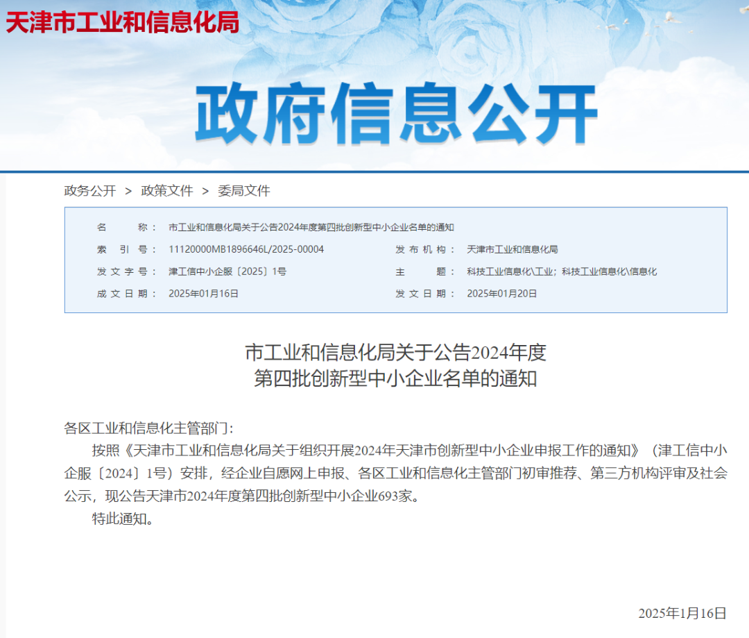 2025120日,天津市經濟和信息化局正式發布了《2024年度第四批創新型中小企業公告名單》,東西分析儀器(天津)有限公司(簡稱:東西分析)順利通過了創新型中小企業認定,成功入選榜單。這不僅是對東西分析持續創新能力的認可,也標志著其在行業中的競爭力和影響力的提升。