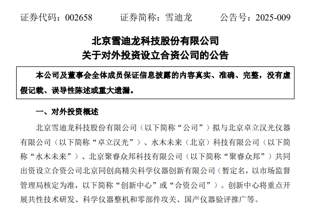 2月21日,雪迪龍(002658)發(fā)布公告,公司擬與北京卓立漢光儀器有限公司(以下簡(jiǎn)稱“卓立漢光”)、水木未來(lái)(北京)科技有限公司(以下簡(jiǎn)稱“水木未來(lái)”)、北京聚睿眾邦科技有限公司(以下簡(jiǎn)稱“聚睿眾邦”)共同出資設(shè)立合資公司北京同創(chuàng)高精尖科學(xué)儀器創(chuàng)新有限公司(暫定名,以市場(chǎng)監(jiān)督管理局核定為準(zhǔn),以下簡(jiǎn)稱“創(chuàng)新中心”或“合資公司”)。創(chuàng)新中心將重點(diǎn)開展共性技術(shù)研發(fā)、科學(xué)儀器整機(jī)和零部件攻關(guān)、國(guó)產(chǎn)儀器驗(yàn)評(píng)推廣等。